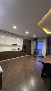 Интерьер выполнен из натурального дуба, премиального паркета, с люстрами Swarovski.